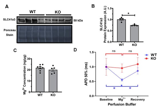 SLC41 expression and Mg2+ concentration alters the monophasic action potentials (MAPs). (A) Protein expression of SLC41a3 in WT and KO hearts. (B) Quantitative SLC41a3 protein expression from WT and KO hearts are the mean ± SEM. * represents p≤0.05. (C) Serum magnesium concentrations from WT and KO mice are the mean ± SEM. (D) LV surface MAPs at 50% repolarization (APD 50%) in WT hearts (blue) and KO hearts (red) normalized to baseline measurements, followed by exposure to MgSO4 (Mg2+) following a recovery period with the original buffer. The data represented are the mean ± SD. * represents p < 0.05.