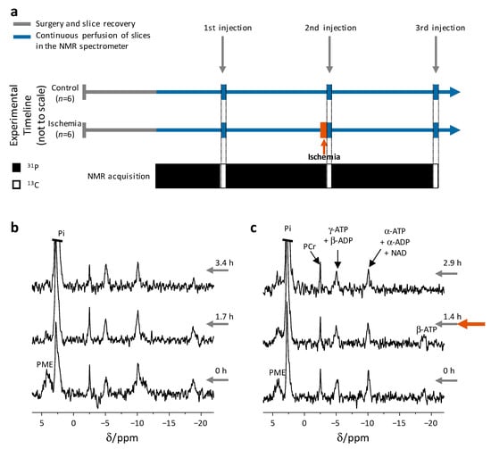 The following are available online at https://www.mdpi.com/article/10.3390/metabo11040210/s1, Note S1 and Figure S1: Selective pulse calibration and response, Note S2 and Figure S2: 31P spectra during an ischemic insult, Note S3 and Figure S3: ATP content in the brain slices throughout the experiment, Note S4: O2 content in the perfusion medium, Table S5: Summary of parameters and data of individual injections included in this study.