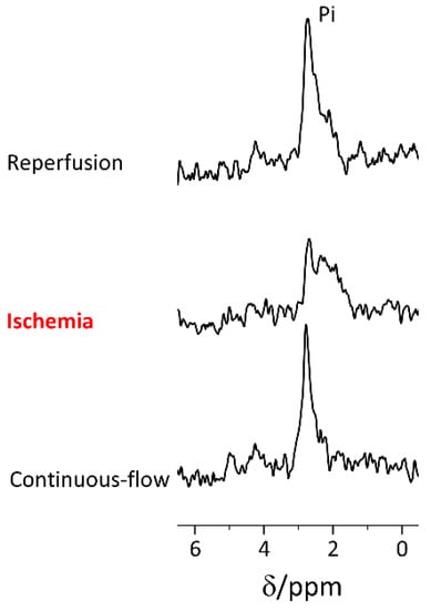 During ischemia, short (7.6 min) 31P acquisitions were recorded. Figure 2 shows that the signal of the inorganic phosphate in this spectrum is displaced to lower field and its line shape is different. This finding indicated acidification of the tissue and the medium combined, as the chemical shift of the Pi signal can be used as a pH indicator [,]. As the perfusion medium contains inorganic phosphate, the Pi signal is composed of both intracellular and extracellular compartments and both appear to acidify during the perfusion arrest. These changes were observed in all of the ischemia-reperfusion experiments (n = 6). Taking the extra- and the intracellular compartments signals together as one signal, we analyzed the overall pH change using the multi-parametric approach proposed by Lutz et al. [] and found a reduction of 0.22 ± 0.12 pH units (weighted mean pH) during the perfusion arrest period, from 7.01 ± 0.09 before the perfusion arrest period to 6.79 ± 0.08 following this period (in 6 experiments, p = 0.001, in a paired, two-tailed Student’s t test).