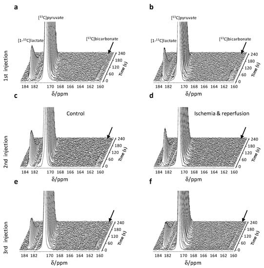Figure 3 shows consecutive 13C spectra from typical control (a, c, and e) and ischemia-reperfusion (b, d, and f) experiments. Following the first injection, the signals of the products [1-13C]lactate and [13C]bicarbonate were observed at similar intensities in both experimental groups (Figure 3a,b). In the second injection, for the ischemia-reperfusion group, the spectra were acquired immediately following ischemia and the hyperpolarized medium actually provided reperfusion to the slices. Figure 3d, shows that in this condition, the [13C]bicarbonate signal was greatly reduced, compared with the control experiment (Figure 3c). In the third injection, performed approximately 1.5 h later, the intensity of the hyperpolarized [13C]bicarbonate signal recovered, indicating the reversibility of this metabolic change inflicted by the ischemic insult.