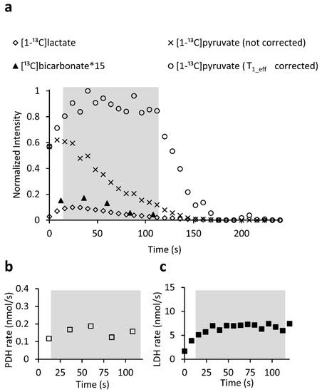 The signals of [1-13C]lactate and [13C]bicarbonate obtained during this time window were used for the calculation of metabolite production rate using Equation (2),