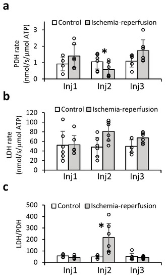 To quantify the enzymatic rates, the data were acquired with the product selective saturating-excitation approach []. Figure 4a shows the signal time course following a typical injection of hyperpolarized [1-13C]pyruvate. Only time points for which the concentration of [1-13C]pyruvate was constant were used for rate determination. Figure 4b,c show the respective rates of PDH and LDH over time following the injection. Comparing the enzymatic rates in the ischemia reperfusion group, PDH activity was significantly lower in injection 2 compared to either injection 1 or injection 3 (p = 0.001 and p = 0.05, respectively, in a non-parametric Tukey-type multiple comparison using the Nemenyi test). Following ischemia, the PDH average value was reduced by 72% from its initial value. In the control group there were no differences between the results obtained in the three injections of any of the tested parameters (Kruskal–Wallis single factor analysis of variance by ranks). The entire dataset with enzymatic rates per injection is provided in the Table S5.