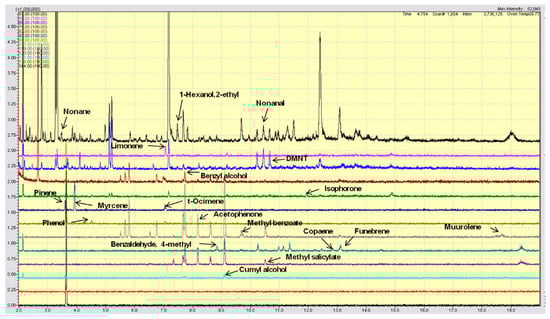 Gas chromatograms of specific olive tree VOCs evaluated using single ion monitoring (SIM) analysis. Different colors are used to better visualize the SIM signals of the VOC compounds (see Table 2), whose peaks are indicated by arrows.