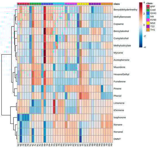 Hierarchical clustering heat map of differential volatile compounds produced by olive trees. Each column represents the samples obtained by plants treated with Trichoderma spores (M10, TH1, T22, KV906, and GV41,) or metabolites (6PP and HA). Water-treated plants served as controls (CTRL). In the heat map, red and blue colors indicate higher and lower chemical abundance, respectively. Treatments are indicated according to the color scale (class) shown in the legend at the top right. Data are presented as individual values from each biological replication. Statistical differences were determined using one-way ANOVA (p < 0.05).