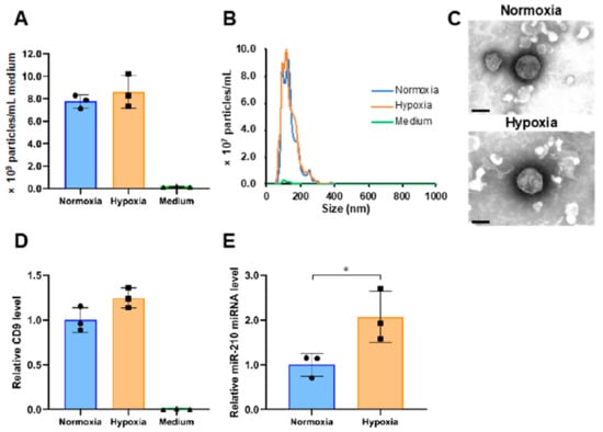 Characterization of small extracellular vesicles (sEVs) derived from PANC-1 cells cultured under different oxygen concentrations. (A) The number of particles in normoxia, hypoxia, and medium samples. (B) Particle size distribution in normoxia, hypoxia, and medium samples. (C) Transmission electron microscopic images of sEVs under normoxia and hypoxia. Scale bar, 100 nm. (D) The relative expression levels of CD9 in normoxia, hypoxia, and medium samples. (E) The expression level of miR-210 in normoxia and hypoxia samples. The expression data were normalized to the number of particles. Symbols indicate the result of each sample, and the bar graphs indicate the mean ± SD (n = 3). The Student’s t-test was used to determine the statistical significance. * p < 0.05.