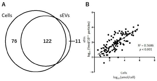 The relationship of hydrophilic metabolites present in cells and small extracellular vesicles (sEVs) obtained under normoxia. (A) Venn-diagram representing the number of hydrophilic metabolites detected in cell and sEV samples. (B) Correlation of the hydrophilic metabolites present in cells and sEVs.