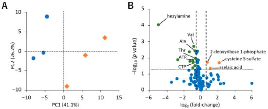 Effect of hypoxic stress on hydrophilic metabolite profiles in small extracellular vesicles (sEVs). (A) Principal component analysis (PCA) score plots for normoxia (blue circle) and hypoxia (orange diamond) samples based on hydrophilic metabolome data. The contribution ratios were 41.1% and 26.2% for PC1 and PC2, respectively. (B) Volcano plot showing the differential accumulation of metabolites under normoxia and hypoxia. The Student’s t-test was used to determine the p value. The plots marked in orange and green are for metabolites that were increased and decreased under hypoxia, respectively. Metabolites that were detected in over 50% samples were included for the analysis. Data were normalized by the number of particles, as quantified by NanoSight. As hexylamine was detected only under normoxia, its log2 (fold-change) value is displayed as −5, n = 3.