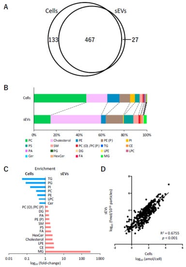 Next, the relationship between the content of each of the lipid classes in cells and sEVs was examined. In cells, the content of PC (46.6%), cholesterol (18.5%), PE (10.9%), and alkenyl-acyl phosphatidylethanolamine (PE (P)) (9.4%) was relatively higher, whereas that of cholesterol (45.0%), PE (P) (15.4%), PC (14.7%), and phosphatidylserine (PS) (8.3%) was higher in sEVs (Figure 4B). A comparison of the ratio of each lipid class to the total lipid content showed that the levels of MG (296 times), cholesterol ester (CE) (2.9 times), lysophosphatidylethanolamine (LPE) (2.9 times), cholesterol (2.4 times), hexosylceramide (HexCer) (2.4 times), free fatty acid (FA) (2.1 times), and PS (2.0 times) increased more than two times in sEVs compared with their respective levels in cells. In contrast, the levels of triacylglycerol (TG) (0.05 times), phosphatidylglycerol (PG) (0.09 times), PI (0.2 times), PC (0.31 times), PE (0.37 times), LPC (0.43 times), and ceramide (Cer) (0.47 times) in sEVs decreased to less than half of their levels in the cells (Figure 4C). Furthermore, the relationship between individual lipids in cells and sEVs was also investigated. Figure 4D shows the differences in the levels of 467 lipids that were common in cells and sEVs. Overall, these profiles were adequately correlated (R2 = 0.6755, p < 0.001).