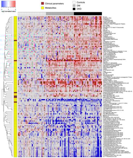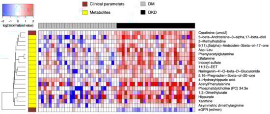 Heatmap of relative abundance values of endogenous compounds (log-transformed, base 2) differentially abundant between 30 DKD patients and 30 DM-N. Data were normalized by the median of the 30 DM-N samples in each metabolite.