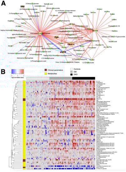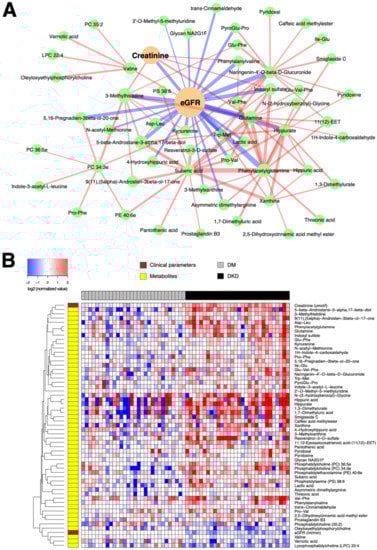(A) Subnetwork signature distinguishing 30 DKD patients from 30 DM-N patients. Network edges are drawn in different colors depending on the sign of the partial correlations (positive in red, negative in blue); thicker edges represent stronger relationships. The size of the nodes corresponds to their respective −log10(q-value) from univariate differential abundance tests (two-sample t-test). (B) To demonstrate the abundance patterns more clearly, heatmap of relative abundance values of individual compounds was drawn (log-transformed, base 2), normalized by the median of DM-N, in which the plasma levels of a majority of compounds were elevated in DKD patients.