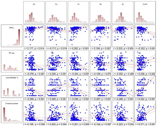 Correlation analysis was performed to determine crude relationship between serum metal levels and markers of the disease severity (Figure 2). Serum Fe, and to a lesser extent Se, Zn, and Ca correlated directly with SpO2, whereas circulating Cu and especially Cu/Zn ratio were inversely associated with blood oxygen saturation. Conversely, circulating Ca, Fe, Se, and Zn levels were characterized by an inverse correlation with lung damage, CT grade, CRP levels, as well as fever. In turn, serum Cu and Cu/Zn ratio were tightly associated with markers of lung damage (relative lung damage, CT grade), inflammation (CRP), and fever (t °Cmax). In corroboration of the outcome of group comparisons, both serum Mn and Mg levels did not correlate significantly with SpO2, fever, lung damage, CT grade, or CRP levels.