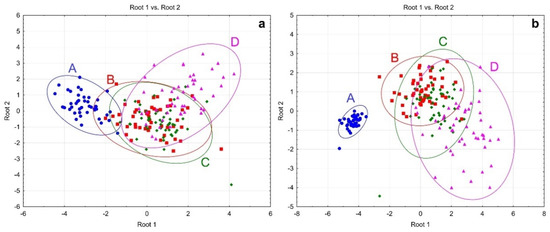 Scatter plot of canonical discriminant analysis based on serum metal levels (a) and clinical, biochemical, hemostatic parameters, as well as serum metal levels (b). A—control group (blue), B—Mild (red), C—Moderate (green), D—Severe (purple).