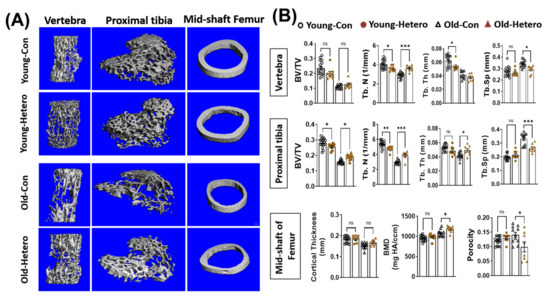 We have reported the reduction of bone tissue, in both the lumber vertebra and the epiphysis of the proximal tibia, in dKO mice when compared with age-matched mdx and WT controls [15]. In this study, we observed significantly reduced bone fraction (BV/TV), trabecular number (Tb. N), trabecular thickness (Tb. Th), and higher trabecular spacing (Tb. Sp) in both the lumber vertebra and proximal tibia in old-dKO-hetero mice (old-con) when compared with young-mdx mice (Young-con) (Figure 2). Interestingly, although it did not reach significance, lower bone mineral density (BMD) (Figure 2). These data demonstrated deleterious bone quality in dKO-hetero mice during the disease progression. Examination of the old dKO-hetero mice in old/young pairings (Old-Hetero) revealed an increase in bone mass and improved bone micro-structure in the lumber vertebra, epiphysis of the proximal tibia, and mid-shaft of femur when compared with the old dKO mice in old/old pairings (Old-con, Figure 2A). Quantitative analyses confirmed that old dKO mice in old/young pairings had: (1) significantly more Tb. N and less Tb. Sp in their lumber vertebra when compared with old dKO mice in old/old pairings (Figure 2B, Vertebra); (2) more BV/TV, Tb. N and Tb. Th, and less Tb. Sp in their epiphysis of the proximal tibia when compared with old dKO mice in old/old pairings (Figure 2B, Proximal tibia); and (3) significantly higher BMD and reduced porosity in the cortical bone of mid-shaft of femur when compared with old dKO mice in old/old pairings (Figure 2B, Mid-shaft of femur). However, no significant differences were observed in BV/TV and Tb. Th in lumber vertebra, and cortical thickness in mid-shaft of femur between groups. Meanwhile, we observed decreased bone mass and deteriorated bone micro-structure in young mdx mice in old/young pairings (Young-Hetero) when compared with the young mdx mice in young/young parings (Young-Con, Figure 2B). Quantitative analyses showed less Tb. N and Tb. Th in lumber vertebra; lower BV/TV and less Tb. N in epiphysis of the proximal tibia in young mdx mice that were paired with old dKO-heteros when compared with young mdx controls. Taken together, these data demonstrated that the pairing of old dKO hetero mice with young mdx mice significantly reduced bone loss in trabecular bone in the old dKO hetero mice and simultaneously causing deleterious bone changes in young mdx mice, although in a lesser extent.