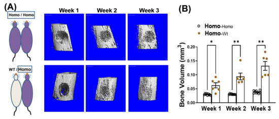 2.3. Improved Bone Healing of dKO-Homo Mice after Paring with WT Mice