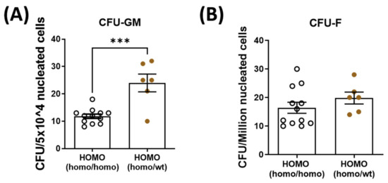 Quantification of bone marrow hematopoietic stem cells (CFU-GM) and mesenchymal stem cells (CFU-F) isolated from the bone marrow. Bone marrow hematopoietic stem cells and mesenchymal stem cells were isolated and quantified from the contralateral tibia. (A): Hematopoietic stem cell quantity was significantly increased in the dKO-homo mice after paired with WT mice. (B): No significant difference was noted in the quantity of bone marrow-derived mesenchymal stem cells between the two groups. Data were expressed as Mean ± SEM; *** p < 0.001.