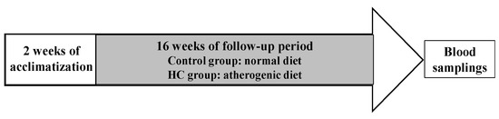 Male Californian-New Zealand hybrid (CAL/NZW) rabbits (n = 12), age 20 weeks and 2700–3000 g bodyweight, were involved in this study. The animals were kept in a conventional experimental animal facility, under a 12 h-12 h light-dark cycle. The rabbits (Jurasko Ltd., Debrecen, Hungary) received during the first two weeks of the adaptation (acclimatization) period commercial laboratory rabbit chow. After the acclimatization period the animals were randomly divided into Control (n = 6) and high-cholesterol diet (HC), atherogenic group (n = 6). During the next 16 weeks, the animals of the Control group were fed with standard rabbit chow, while a special “atherogenic” chow (additional 1% cholesterol and 1% saturated fat, formulated in the Department of Pharmaceutical Technology, Faculty of Pharmacy, University of Debrecen) were given in the HC group [19,61]. At the end of the follow-up period, blood samples were taken (Figure 6).