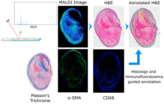 2,5-Dihydroxybenzoic acid (DHB), norharmane, Fluoroshield with DAPI, Monoclonal Anti-Actin α-Smooth Muscle antibody, LC-MS grade methanol, HPLC grade chloroform, Bouin’s solution, Triton X-100, Tween 20, poly-L-lysine solution 0.1% and Peel-a-Way embedding molds (truncated, 12 × 12 × 20 mm) were purchased from Sigma-Aldrich, Saint Louis, MO, USA. Histology-grade solvents, Eosin G or Y (alcoholic solution 0.5%) and Masson’s Trichrome staining kit were purchased from DiaPath S.p.A., Martinengo, Italy, while QA-Agarose low melting point was obtained from MP Biomedical, Santa Ana, CA, USA. Harris hematoxylin, phosphate buffer saline (PBS) tablets, bovine serum albumin (BSA), SuperFrost Plus glass slides and cover slides were purchased from VWR International, LLC, Radnor, PA, USA. Trifluoroacetic acid (TFA), Antihuman CD68 antibody and AlexaFluor 568 goat anti mouse secondary antibody were purchased from Life Technologies-Invitrogen, Carlsbad, CA, USA. LC-MS grade water was purchased from Thermo Fisher Scientific, Rockford, IL, USA, while ITO coated glass slides for MALDI were obtained from Bruker Daltonics, Billerica, MA, USA. Paraformaldehyde 4% solution was purchased from Alfa Aesar, Haverhill, MA, USA.