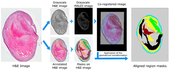 Image co-registration was performed in MATLAB. High resolution histological images were imported into MATLAB, cropped, resized and rotated to better match the MALDI MSI dataset; the histological image was then converted to grayscale. A representative MS image from the MALDI MSI datacube was also converted to grayscale. The representative MALDI image corresponded to a high intensity ion co-localizing with the tissue section, an example of which is shown in Figure 2. The histological and MS images were then co-registered using an intensity-based co-registration algorithm (see methods for details). The transformation matrix, including initial cropping, rotation and scaling, was saved in a structured file for subsequent application to the annotation mask image. The annotation mask images were created from the border coordinates of the annotated regions using the command poly2mask (Figure 2). Co-registered masks were saved as a structured file for subsequent use during data analysis.