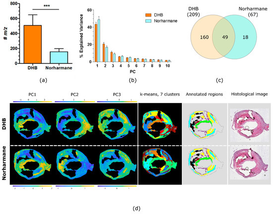 The number of discrete lipid ions detected with DHB and norharmane is shown in Figure 3a. A paired t-test demonstrated that DHB produced a significantly greater number of peaks compared to norharmane (509 vs. 157, p < 0.001, n = 6). Principal component analysis (PCA) was performed on each tissue section’s MSI data, for both matrices. The PCs generated by PCA maximize the variance in the data; the PCs capture the largest spread in the data and so effectively summarize its information content. The variance represented by the first ten principal components (PCs) is plotted in Figure 3b. The variance explained by the first PC of the DHB dataset was lower but was not statistically significant (paired t-test, p = 0.060, n = 6) compared to the variance explained by norharmane dataset. The DHB dataset contained 209 lipid ions that were detected in the tissue sections of all six patients; the norharmane dataset contained just 67 lipid ions common to all six patients, 49 of which were also common to the DHB dataset, Figure 3c and Supplementary Material 2.