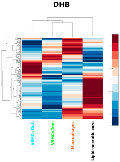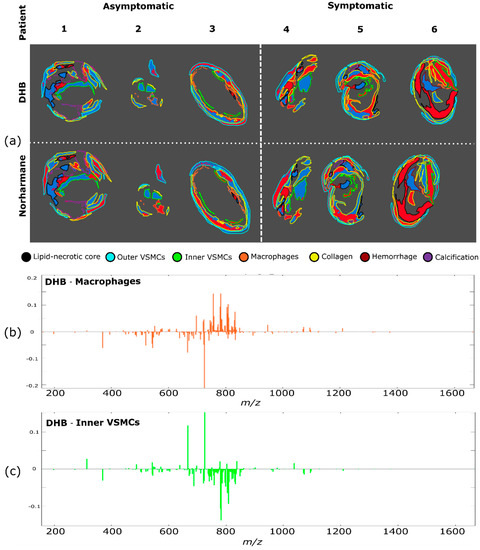 To test whether areas from symptomatic plaques could be distinguished from the corresponding regions of asymptomatic plaques, we performed a region-specific cluster analysis, so that the significant differences in lipid composition between different regions did not mask any changes associated with plaque outcome. For each region, a k-means cluster analysis was performed with two clusters (Figure 4 and Figure S8) and the analysis was performed separately for the datasets measured with the DHB and norharmane matrices. Inner VSMCs and macrophage-rich regions both exhibited a dependence on the plaque outcome, with most pixels from symptomatic plaques clustering in cluster 2 (indicated in red) separately from asymptomatic plaques; inner VSMCs clusterization was consistent for datasets measured using both DHB and norharmane. The fate of macrophages has been linked to plaque outcome, with macrophage apoptosis increasing the size of the necrotic core, and thus helping sustain plaque inflammation and reducing plaque stability [6,32]. VSMC senescence and cell death have been linked to plaque vulnerability, and thus VSMCs have been postulated to have a crucial role in preventing plaque rupture [8,33,34].