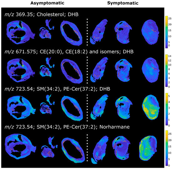 The use of the DHB matrix led to MSI datasets containing a greater average number of ions correlating with the tissue’s histology than norharmane matrix. Moreover, the inner and outer VSMCs were distinguishable by PCA and k-means cluster analysis only in the MALDI MSI dataset acquired with DHB matrix. Thus, DHB performed better than norharmane. Nevertheless, the patient series was analyzed using both matrices to partially confirm, with the second matrix, lipid species found to be associated with the presence of symptoms, and thereby guarding against artifacts due to ionization bias.