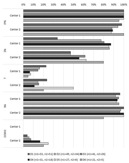 Percentage of patients within the 6 days of the study, according to the medical procedure (n1 = number of patients in center 1; n2 = number of patients in center 2). IPN: infusion and parenteral nutrition; EN: enteral nutrition; T: transfusion; RA: respiratory assistance; ECMO: extracorporeal membrane oxygenation.