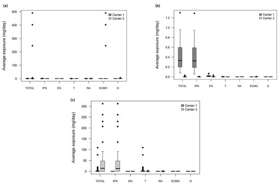 Boxplot of the average exposure doses of patients (mg/day) calculated by Fick’s model for: (a) DEHP, (b) DEHT, and (c) DINP (the central mark is the median, the edges of the box are the 25th and 75th percentiles, the upper whisker is calculated as the maximum of (75th percentile + 1.5 × (75th percentile – 25th percentile)), the lower whisker is calculated as the minimum of (25th percentile–1.5 × (75th percentile – 25th percentile)), and the dots represent outliers. IPN: infusion and parenteral nutrition; EN: enteral nutrition; T: transfusion; RA: respiratory assistance; ECMO: extracorporeal membrane oxygenation; O: others. DEHP: di-(2-ethylhexyl) phthalate; DEHT: di-(2-ethylhexyl) terephthalate (DEHT); DINP: di-isononyl phthalate.