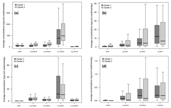 A total of 350 urinary samples were analyzed (208 from Center 1 and 142 from Center 2). All the metabolites of each plasticizer were found in the patients’ urine, but their levels varied widely, depending on the plasticizers and the center considered (Figure 3).