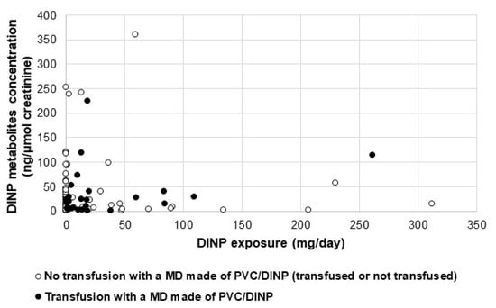 Scatterplot of DINP metabolites’ concentration by DINP exposure, according to the presence (black dots) or absence (white dots) of at least one transfusion performed with a MD made of PVC (PolyVinyl Chloride)/DINP.
