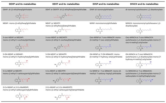 Structure and denomination of DEHP, DEHT, DINP, and DINCH, and their metabolites.