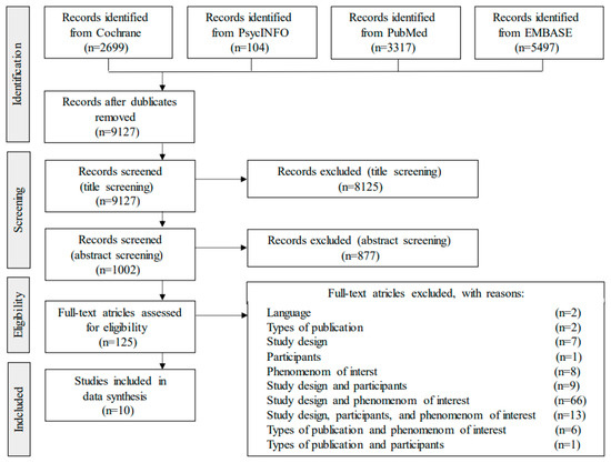 The literature search resulted in a total of 9127 records after removing duplicates. 8125 records were excluded from screening of titles. Additionally, 877 records were excluded from screening of abstracts. 125 full-text articles were assessed for eligibility and 10 articles were eligible for the purpose of the review (Figure 1).