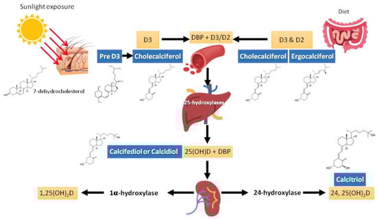 The synthesis of vitamin D3 (cholecalciferol, D3) occurs at the skin where pro-vitamin D3 (7-dehydrocholesterol) is converted to pre-vitamin D3 in response to sunlight exposure (ultraviolet B radiation). Vitamin D3, obtained from the isomerization of pre-vitamin D3 in the epidermal basal layers, or intestinal absorption of natural and fortified foods and supplements D2 (ergocalciferol) and D3, binds to vitamin D-binding protein (DBP) in the bloodstream, and is transported to the liver. D2 and D3 are hydroxylated by liver 25-hydroxylases. The resultant 25-hydroxycholecalciferol [25(OH)D] (calcifediol or calcidiol) is 1-hydroxylated in the kidney by 1α-hydroxylase. This yields the active secosteroid 1,25(OH)2D (calcitriol), which has different effects on various target tissues. The synthesis of 1,25(OH)2D from 25(OH)D is stimulated by the parathyroid hormone and suppressed by calcium, phosphate, and 1,25(OH)2D itself.