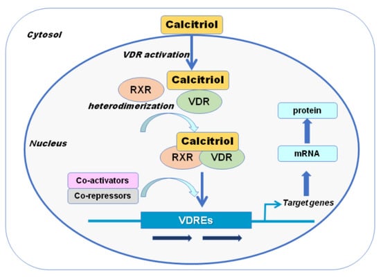 Vitamin D receptor (VDR) action at target cells. Intracellular calcitriol [1,25(OH)2D] binds to the VDR; thus, causing its dimerization with the retinoid X receptor (RXR). The ligand-bound VDR–RXR complex binds to structurally distinct vitamin D response elements (VDREs) in multiple, widely spaced vitamin D-responsive regions, and this causes a modification in the recruitment of co-activators or co-repressors, which leads to positive or negative transcriptional regulation of gene expression.