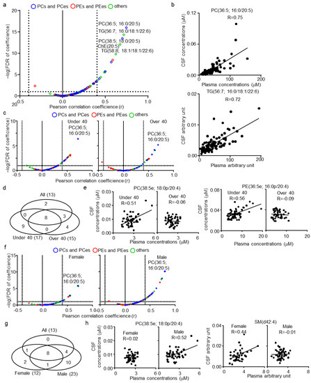 Cerebrospinal fluid (CSF)–plasma correlations of lipids in healthy human subjects. (a) Individual lipid plot of false discovery rate (FDR) and correlation coefficients (r) in all subjects. (b) Individual plot of representative lipids correlated among CSF and plasma. (c) Individual lipid plot of FDR and correlation coefficients in ≤40 (younger group) and >40 (older group) years-old subjects. (d) Venn diagram of correlated lipids in all, younger, and older subjects. (e) Individual plot of age-specific representative lipids correlated among CSF and plasma. (f) Individual lipid plot of FDR and r in female and male subjects. (g) Venn diagram of correlated lipids in all, female, and male subjects. (h) Individual plot of sex-specific representative lipids correlated among CSF and plasma.