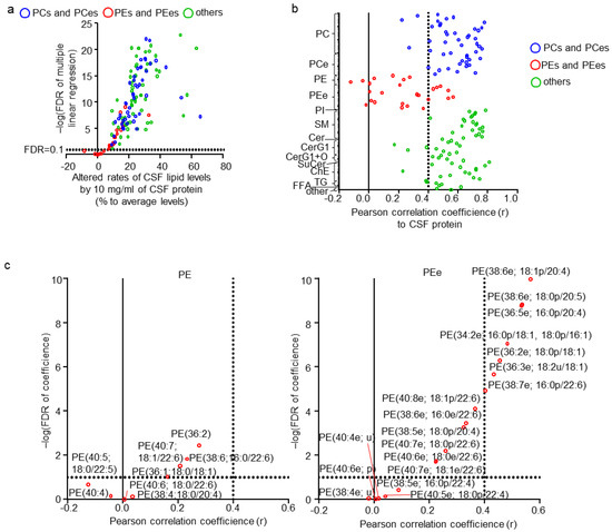 Effects of cerebrospinal fluid (CSF) properties on CSF lipids. (a) Individual lipid plot of false discovery rate (FDR) and estimated beta corresponding to 10 mg/mL of CSF total protein levels. (b) Individual lipid plot of correlation coefficients to CSF total protein levels. (c) Extracted individual lipid plot of FDR and correlation coefficients of phosphatidylethanolamine (PEs) and ether-type PEs (PEes).