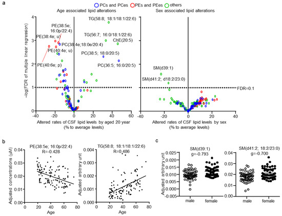 Next, the effects of age and sex, which are major factors affecting lipid levels in plasma, on CSF lipids were evaluated. No correlation was found (|r| < 0.4) between CSF total protein levels, age, and sex (Table S7). CSF total protein levels, age, and sex were evaluated independently, using a multiple regression model and estimated beta, p, and FDR for these three factors (Table S8). Of the total quantitated CSF lipids, 33 and two (24.8% and 1.5%, respectively) were associated with age and sex, respectively (Figure 4a; FDR < 0.1). Ten lipids were positively associated with age, eight of which contained the highly unsaturated FA; FA(20:5), FA(22:5), or FA(22:6). In contrast, 23 lipids were negatively associated with age, with 15 of them being PCes and PEes, and of those nine were PCps and PEps. The representative correlation plot of lipids TG(58:6; 16:0/18:1/22:6) and PE(38:5e; 16:0p/22:4), adjusted for the other two factors, are shown in Figure 4b. The lipids associated with sex were both SMs with odd numbered carbon chains, namely SM(d39:1) and SM(d41:2; d18:2/23:0). The individual plot of these lipids, adjusted for the other two factors, are shown in Figure 4c.