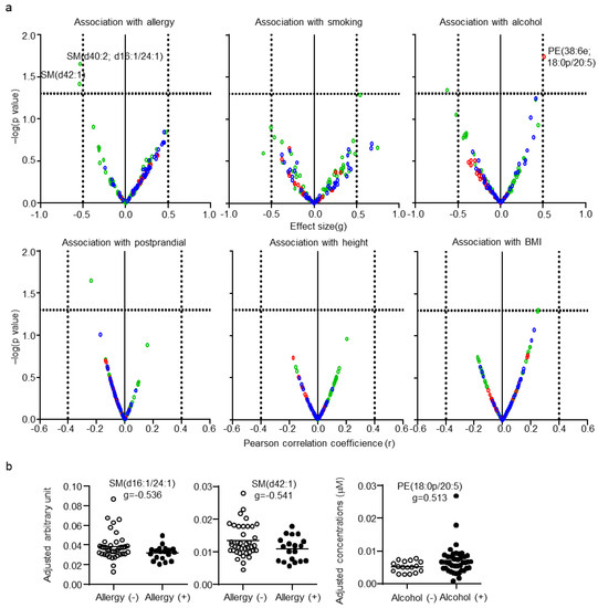 After adjustment for CSF total protein levels, age, and sex, the effects of subject background on CSF lipid levels were determined. Since the information regarding the other subject backgrounds was random in some subjects, these factors were examined individually. Each categorical parameter was evaluated using effect size, whereas each numerical parameter was evaluated using correlation coefficients. Only three lipids, SM(d40:2; d18:1/24:1), SM(d42:1) for allergy, and PE(38:6e; 18:0p/20:5) for alcohol habit, were defined as being associated with the other subject backgrounds (Figure 5a). The individual plot of these lipids with adjustment are shown in Figure 5b. No significant association of any CSF lipid with smoking, postprandial effect, height, or BMI was found.