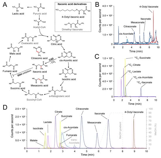 Detection of itaconate and isomers by high performance liquid chromatography-tandem mass spectrometry (HPLC-MS/MS). (A)—Chemical structures of tricarboxylic acid (TCA) cycle intermediates, itaconic acid isomers and derivatives. Compounds that can be quantified by the HPLC-MS/MS assay are highlighted in black. (B)—HPLC-MS/MS ion chromatogram of cis-aconitate, itaconic acid and isomers, and 4-octyl itaconate at the lower limit of quantification (LLOQ) (245 fmol on column for cis-aconitate and citraconate; 490 fmol on column for itaconate and mesaconate and 100 fmol on column for 4-octyl-itaconate). (C)—HPLC-MS/MS ion chromatograms of the employed internal standards. (D)—HPLC-MS/MS ion chromatograms of all analytes included in the method are highlighted in black. 4-octyl-itaconate eluted after applying the methanol gradient (dashed line in grey); trans-aconitate (grey) could be identified but was not quantified in this assay.