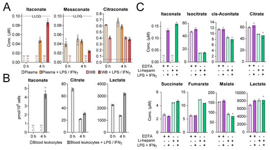 Itaconate levels in LPS/IFNγ−stimulated whole blood. (A)—Itaconate and mesaconate were detectable in whole blood (WB) and plasma after 4 h of stimulation, but could not be quantified reliably, since concentrations were <LLOQ. Citraconate levels were significantly higher, but not affected by LPS/IFNγ−stimulation. Plasma was obtained from Li-heparin anticoagulated blood collection tubes. Dashed line marks LLOQ. Samples from donor A; n = 3 aliquots from the same blood draw; mean ± SEM; n/d: not detected. Concentrations of TCA intermediates from this experiment are shown in Figure S1. (B)—Itaconate levels were quantifiable in blood leukocytes present in buffy coats from donor A upon LPS/IFNγ-stimulation; n = 3; mean ± SEM; n/d: not detected Citrate and lactate are shown to reveal the shift towards aerobic glycolysis. (C)—Comparison of TCA metabolite levels in EDTA and Li-heparin blood stimulated with LPS/IFNγ for 4 h. Itaconate was quantifiable in both preparations of stimulated blood, but mesaconate and citraconate levels were not detectable. TCA metabolite levels varied greatly when comparing EDTA and Li-heparin blood while citraconate and mesaconate levels were <LLOQ. Samples from donor B, n = 2 replicates from the same blood draw; mean; n/d: not detected.
