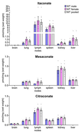 The extensively documented functions of itaconate in the immune system are fully consistent with our observations that its highest concentrations were found in spleen and lymph nodes. Surprisingly, citraconate, too, was most abundant in lymph nodes, and a biologically relevant role in immunity would be intriguing and should be the subject of future studies. It should be kept in mind that the examined organs were obtained from healthy but relatively old (44–46 weeks) mice that were not kept under specific pathogen-free conditions. To our surprise, appreciable concentrations of itaconate were detected in lymph nodes and spleen even though there was no evidence of systemic inflammation. Further research is necessary to test whether increasing age and/or physiological low-grade immune reactions in mice can lead to concentrations in the range detected in our study. In any case, itaconate levels would be much higher in the context of systemic or severe local inflammation, which might also change the observed relative abundances in the examined organs.