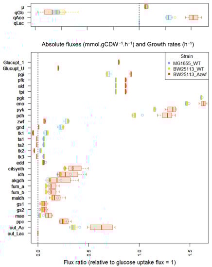 Metabolic fluxes measured for E. coli WT strains and a Δzwf mutant strain. Top: experimentally measured fluxes (expressed in mmol·gDW−1·h−1) and growth rate (expressed in h−1). Physiological measurements: µ, growth rate; qGlc, glucose specific consumption rate; qAce, acetate specific production rate; qLac, lactate specific production rate. Bottom: Intracellular fluxes calculated from the 13C-labelling data; fluxes are expressed relative to the glucose uptake rate set arbitrarily to 1 for each strain. Boxplot produced with the software R representing median fluxes (bold line) in boxes representing the interquartile range (quartile 1–quartile 3). The whiskers extend to the most extreme data point that is no more than 1.5 times the interquartile range from the box. Net fluxes: Glucupt_1 and Glucupt_U: [1-13C]-glucose and [1-13C]-glucose importation (PTS system), pgi: glucose-6-phosphate isomerase, pfk: phosphofructokinase, ald: fructose-bisphosphate aldolase, tpi: triose-phosphate isomerase, pgk: phosphoglycerate kinase, eno: enolase, pyk: pyruvate kinase, pdh: pyruvate dehydrogenase, zwf: glucose 6-phosphate dehydrogenase, gnd: phosphogluconate dehydrogenase, tk1: half-reaction transketolase (1), ta1: half-reaction transaldolase (1), ta2: half-reaction transaldolase (2), tk2: half-reaction transketolase (2), tk3: tk2: half-reaction transketolase (3), edd: Entner-Doudoroff enzymes: equivalent to 6-phosphogluconate dehydratase and 2-keto-3deoxy-6phosphogluconate (KDPG) aldolase, citsynth: citrate synthase, idh: isocitrate dehydrogenase, akgdh: alpha-ketoglutarate dehydrogenase, fum_a and fum_b: fumarase, maldh: malate dehydrogenase, gs1: isocitrate lyase, gs2: malate synthase, mae: malic enzyme, ppc: equivalent to pep carboxylase (forward flux) and to pep carboxykinase (reverse flux), out_Ac: acetate output (equivalent to acetate kinase).
