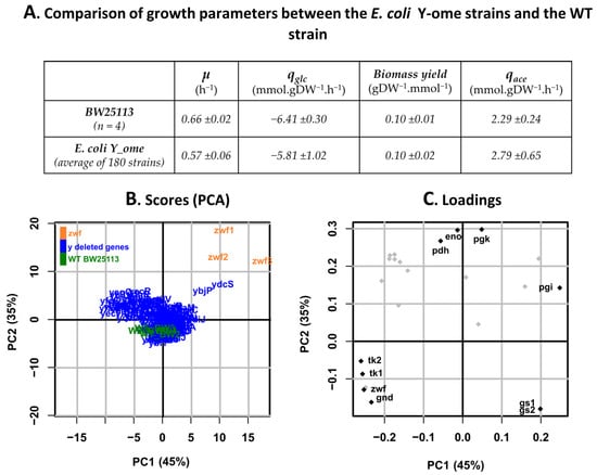 Comparison of the growth parameters and fluxotypes of y-ome strains with those of their parental strain. (A) Comparison of growth parameters between y-ome strains and the BW25113 WT strain (µ: growth rate, qglc: glucose consumption rate, Biomass yield, qace: acetate production rate). (B) PCA plots showing the strains with the most different fluxotypes across the y-ome. PC1 and PC2 represent Principal Component 1 and 2, explaining the largest variance between strains according to their flux values-the percentage of variance explained for each principal component is indicated into brackets [36], (C) PCA loading plot with the most impacted fluxes indicated.