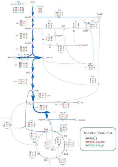 2.6. Glucose Fluxotypes of ΔybjP and ΔydcS Strains