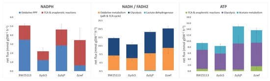 The changes in carbon fluxes were associated with changes in the supply of adenosine-triphosphate (ATP) and redox cofactors by the central carbon metabolism (Figure 5). The ΔydcS strain produced ATP at a slightly lower rate than the WT strain did. Its redox status was significantly impaired. In particular, reduced Nicotinamide Di-Nucleotide Phosphate (NADPH) production was drastically decreased, due to the much lower flux through the PPP and the absence of compensation via the TCA cycle or malic enzyme. Because this strain grows roughly as fast as the WT strain, hence, has similar biosynthetic requirements, it is likely that the reduced production of NADPH via carbon metabolism (Figure 5) is compensated by increased transhydrogenase activity [37]. The ΔybjP strain had different ATP and redox profiles. First, this strain produces ATP faster than the WT strain due to the significantly increased fluxes through glycolysis and acetate metabolism. Interestingly, the same ATP production profile was observed in the Δzwf strain (Figure 5), but the latter was significantly impaired for NADPH production, while the ΔybjP strain produced NADPH at only a slightly lower rate than the WT strain. This reflects a smaller reduction in PPP flux and an increase in malic enzyme flux, which accounted for 16% of CCM-derived NADPH production in this strain compared to 4% in the WT strain. The latter increase might be the result of a mechanism used to compensate for the decreased NADPH production via the oxidative PPP. In addition, NADH production was significantly higher in the ΔybjP mutant than in the WT strain, mainly due to a large increase in glycolytic production of NADH. This resulted in the production of lactate, suggesting a global imbalance in redox metabolism in this strain.