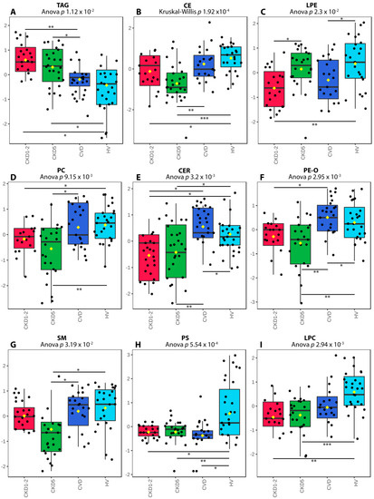Differentially accumulated lipid classes sorted according to Anova/Kruskal–Wallis p-values: (A) triacyloglycerols (TAG). (B) cholesterol and cholesterol esters (CE). (C) lysophosphatidylcholines (LPE). (D) phosphatidylcholines (PC). (E) ceramides (CER). (F) phosphatidylethanolamines (PE-O). (G) sphingomyelins (SM). (H) phosphatidylserines (PS). (I) lysophosphatidylcholines (LPC). A box on a plot presents interquartile ranges and medians. The black dots correspond to the normalized accumulation of lipid classes in all samples. The notch indicates the 95% confidence interval around the median of each group. The mean level is indicated with a yellow diamond. Bars and asterisks show the results of U-Mann–Whitney/t-test: * p < 0.05, ** p < 0.01, *** p < 0.001; n = 25 in each group.
