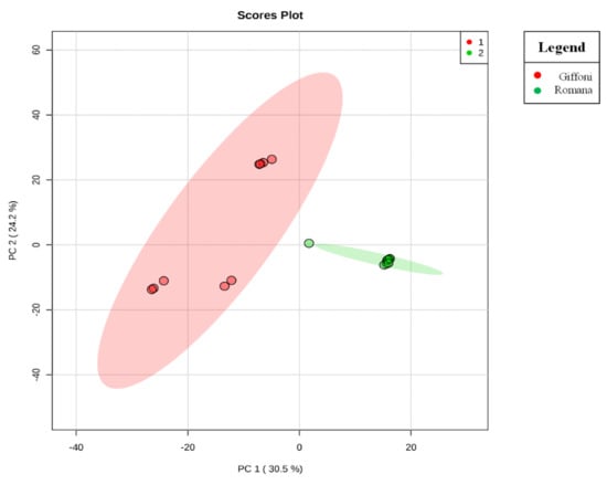 Principal component analysis (PCA) scores plot. The PCA scores plot shows a clear segregation of Tonda di Giffoni and Romana samples, indicating that Tonda di Giffoni and Tonda Gentile Romana have different metabolic profiles.