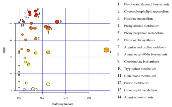 Metabolic Pathway Analysis (MetPA). All the matched pathways are displayed as circles. The colour and size of each circle are based on the p-value and pathway impact value, respectively. The graph was obtained by plotting the −log of p values from the pathway enrichment analysis on the y-axis and the pathway impact values derived from the pathway topology analysis on the x-axis.