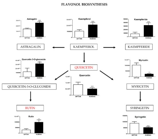 The level of metabolites involved in the Flavonol biosynthesis were analyzed in Giffoni and Romana hazelnut skin. Values are presented as the mean ± SD. *** (p ≤ 0.001).