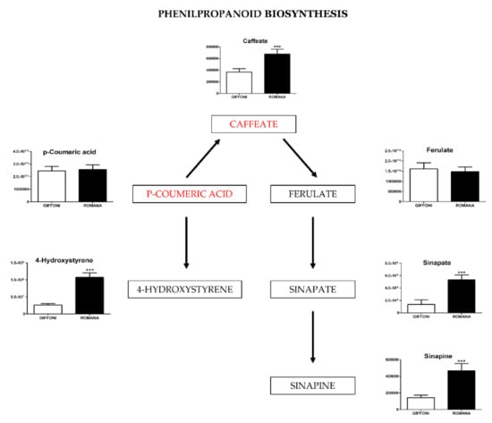 The figure represents metabolites involved in the Phenilpropanoid biosynthesis found in different concentrations in the two varieties of hazelnut skin. Data are presented as the mean ± SD. *** (p ≤ 0.001).