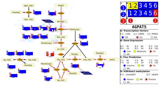 Data visualization of the tri-acyl glycerol synthesis pathway during differentiation of adipocytes. Activation of parts of the synthesis pathway at the end of the differentiation is easily visible. Reactions are represented as orange rhombus, metabolites by light yellow boxes and miRNAs as dark blue trapezoids. The metanode legend can be found on the right side.